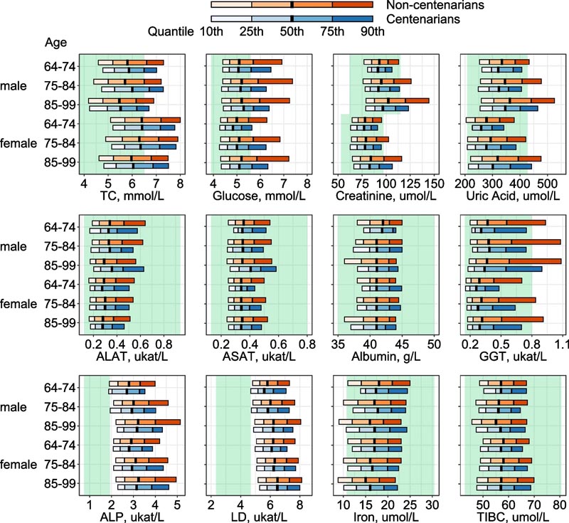 Figure : Quantiles (10, 25, 50, 75, 90) de biomarqueurs pour les centenaires et les non-centenaires. Les zones vertes montrent la plage normale de chaque biomarqueur en fonction des seuils cliniques couramment utilisés (voir le tableau supplémentaire 1 pour plus de détails). Plusieurs données imputées ont été utilisées et 44 636 participants ont été inclus. TC : cholestérol total ; ALAT, alanine aminotransférase; ASAT, aspartate aminotransférase ; GGT, gamma-glutamyl transférase ; ALP, phosphatase alcaline ; TIBC, capacité totale de fixation du fer.